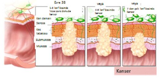 Evre 0 (Prekanseröz) Bu evrede kanser hücreleri, bağırsakların en iç tabakasında (mukoza) bulunur ve henüz diğer tabakalara yayılmamıştır. Bu aşama, "in situ" kanser olarak da bilinir ve genellikle tedavi edilebilir. Evre I Evre I, kanserin mukoza tabakası dışında, bağırsak duvarının alt katmanlarına (submukoza) yayıldığı aşamadır. Bu aşamada, kanser hücreleri genellikle lenf düğümlerine yayılmaz. Tedavi genellikle cerrahi müdahale ile kanserli dokunun çıkarılmasını içerir. Evre II Bu evrede, kanser hücreleri bağırsak duvarının daha derin katmanlarına (muscularis) ve çevresindeki dokulara yayılabilir. Ancak, lenf düğümlerine yayılma durumu yoktur. Evre II bağırsak kanseri, daha fazla tedavi gerektirebilir ve genellikle cerrahi müdahale sonrasında kemoterapi önerilmektedir. Evre III Evre III, kanser hücrelerinin bir veya daha fazla lenf düğümüne yayıldığı aşamadır. Bu evrede kanser, bağırsak duvarının ötesine geçmesine rağmen, uzak organlara yayılmamıştır. Tedavi genellikle cerrahi müdahale ve ardından kemoterapi veya radyoterapiyi içermektedir. Evre IV Bu en ileri evre, kanserin uzak organlara (karaciğer, akciğer gibi) yayıldığı durumu ifade eder. Evre IV bağırsak kanseri, genellikle tedaviye daha dirençlidir ve tedavi seçenekleri sınırlı olabilir. Tedavi, genellikle semptomları yönetmeyi ve yaşam kalitesini artırmayı hedefler. Tanı Yöntemleri Bağırsak kanseri tanısı, çeşitli yöntemler ile konulmaktadır. Bu yöntemler arasında: